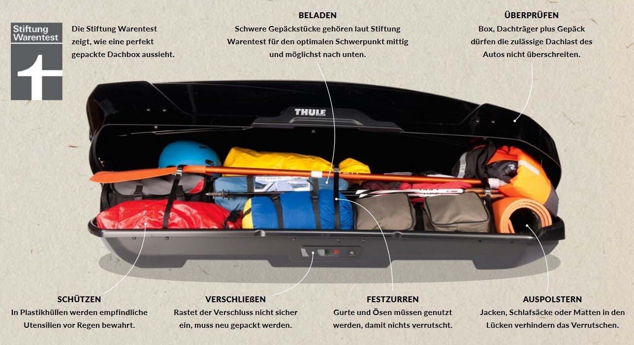 Ösen und Gurte zur Sicherung der Ladung in der Dachbox sind unbedingt zu nutzen, damit das Gepäck nicht verrutscht.