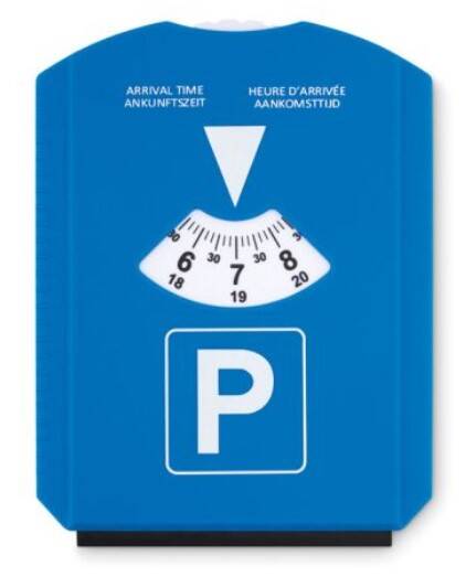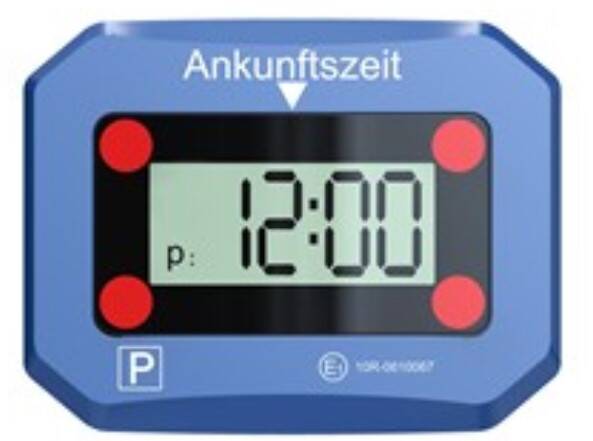 Rein äußerlich muss auf der Vorderseite außerdem, wie bei allen Parkscheiben, das blau-weiße Parken-Verkehrszeichen 314 (weißes "P" auf blauem Grund) abgebildet sein, und über dem Display steht "Ankunftszeit". Weiter ist eine 24-Stunden-Zeitangabe mit einer Zahlenhöhe von mindestens zwei Zentimetern vorgeschrieben.